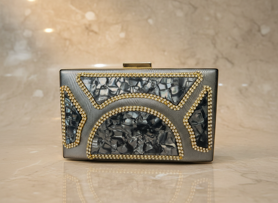 Make a bold yet elegant statement with our Midnight Pearl Crystal Luxury Clutch. Crafted with a rich charcoal pearl-textured finish, this clutch features geometric inlay designs outlined with sparkling crystal embellishments and a polished gold-tone metal frame.